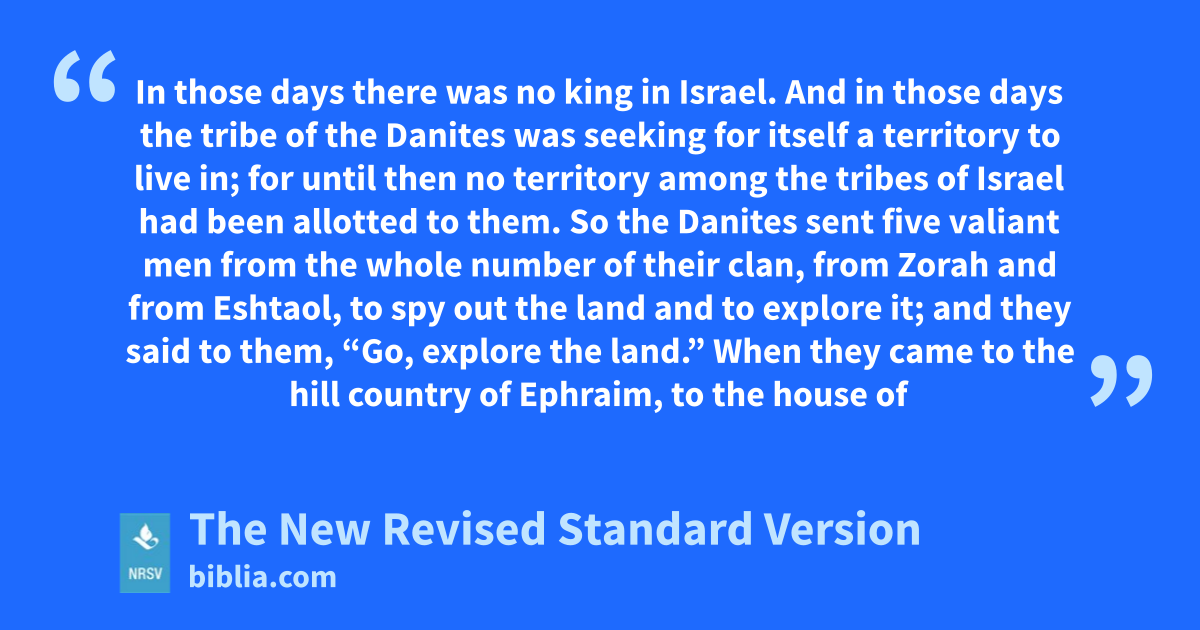 In those days there was no king in Israel. And in those days the tribe of the Danites was seeking for itself a territory to live in; for until then no territory among the tribes of Israel had been allotted to them. So the Danites sent five valiant men from the whole number of their clan, from Zorah and from Eshtaol, to spy out the land and to explore it; and they said to them, “Go, explore the land.” When they came to the hill country of Ephraim, to the house of