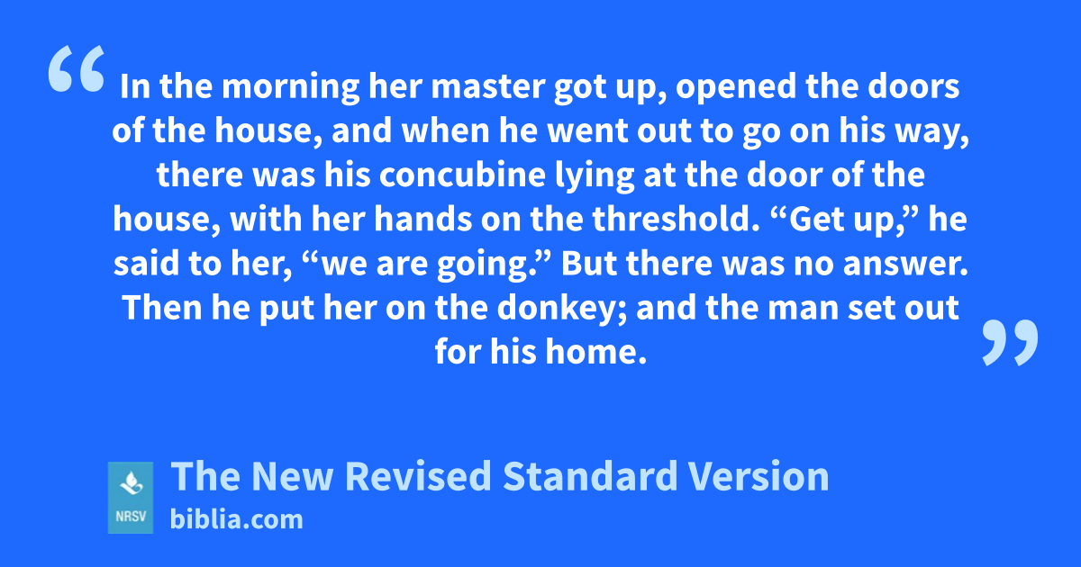 In the morning her master got up, opened the doors of the house, and when he went out to go on his way, there was his concubine lying at the door of the house, with her hands on the threshold. “Get up,” he said to her, “we are going.” But there was no answer. Then he put her on the donkey; and the man set out for his home.