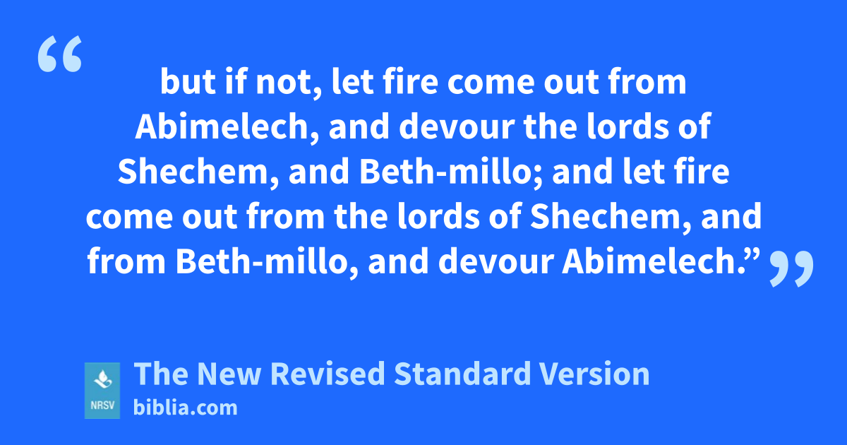but if not, let fire come out from Abimelech, and devour the lords of Shechem, and Beth-millo; and let fire come out from the lords of Shechem, and from Beth-millo, and devour Abimelech.”