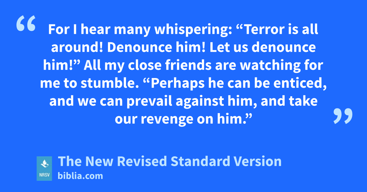 For I hear many whispering: “Terror is all around! Denounce him! Let us denounce him!” All my close friends are watching for me to stumble. “Perhaps he can be enticed, and we can prevail against him, and take our revenge on him.”