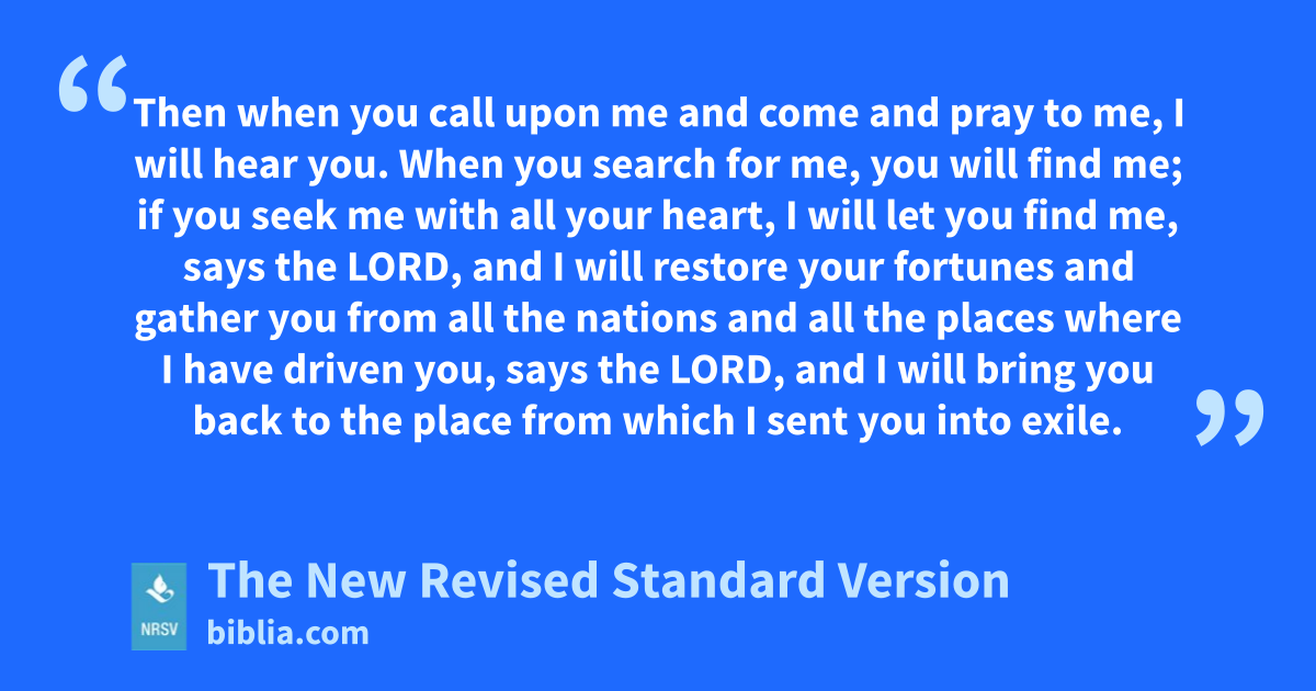 Then when you call upon me and come and pray to me, I will hear you. When you search for me, you will find me; if you seek me with all your heart, I will let you find me, says the LORD, and I will restore your fortunes and gather you from all the nations and all the places where I have driven you, says the LORD, and I will bring you back to the place from which I sent you into exile.