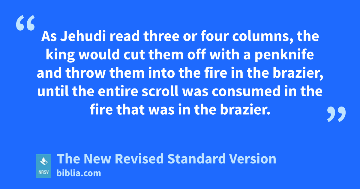 As Jehudi read three or four columns, the king would cut them off with a penknife and throw them into the fire in the brazier, until the entire scroll was consumed in the fire that was in the brazier.