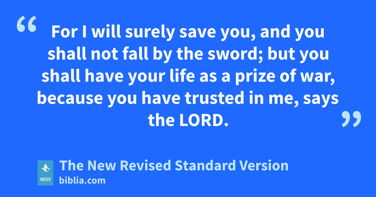 For I will surely save you, and you shall not fall by the sword; but you shall have your life as a prize of war, because you have trusted in me, says the LORD.