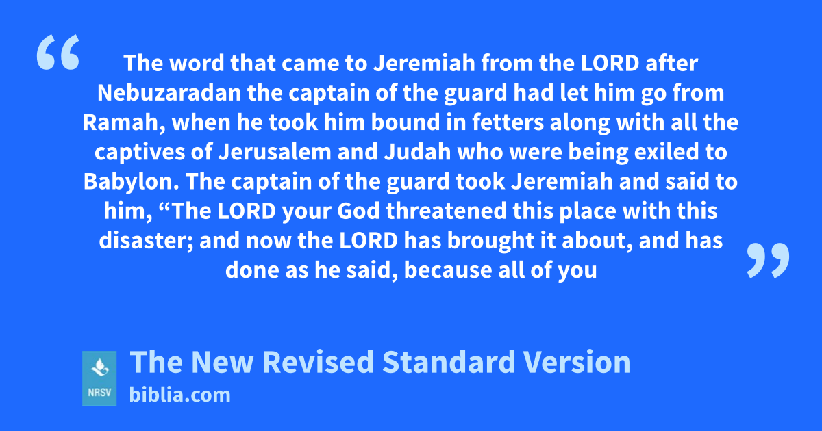 The word that came to Jeremiah from the LORD after Nebuzaradan the captain of the guard had let him go from Ramah, when he took him bound in fetters along with all the captives of Jerusalem and Judah who were being exiled to Babylon. The captain of the guard took Jeremiah and said to him, “The LORD your God threatened this place with this disaster; and now the LORD has brought it about, and has done as he said, because all of you