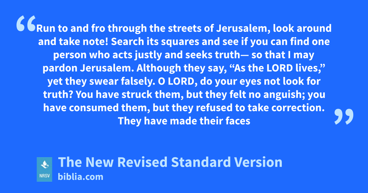 Run to and fro through the streets of Jerusalem, look around and take note! Search its squares and see if you can find one person who acts justly and seeks truth— so that I may pardon Jerusalem. Although they say, “As the LORD lives,” yet they swear falsely. O LORD, do your eyes not look for truth? You have struck them, but they felt no anguish; you have consumed them, but they refused to take correction. They have made their faces