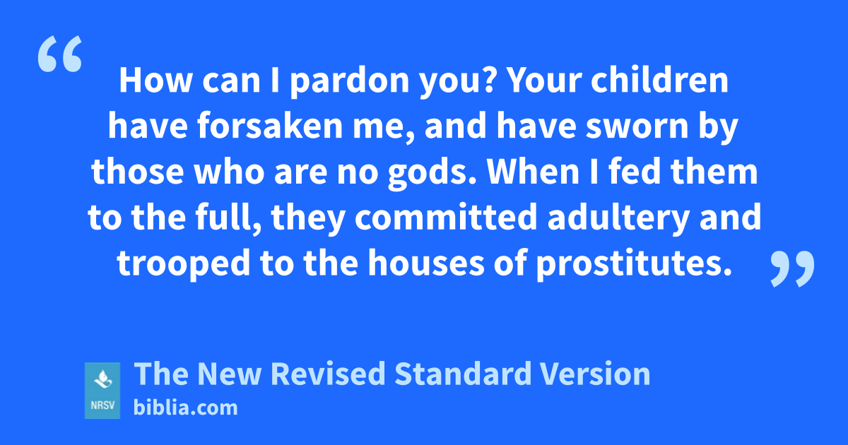How can I pardon you? Your children have forsaken me, and have sworn by those who are no gods. When I fed them to the full, they committed adultery and trooped to the houses of prostitutes.