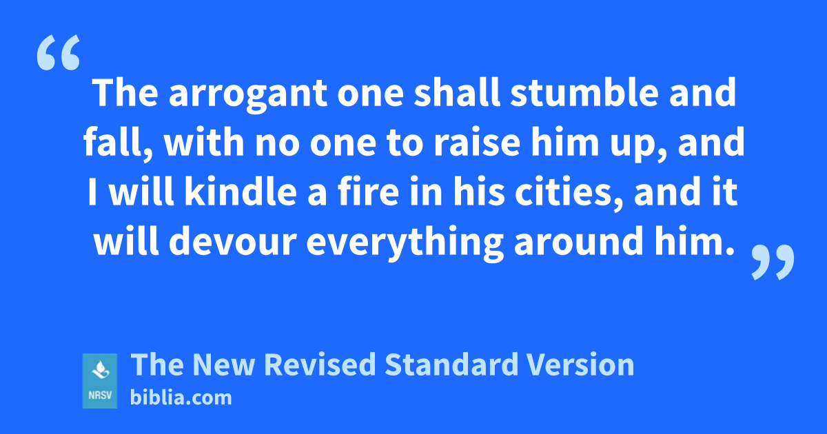 The arrogant one shall stumble and fall, with no one to raise him up, and I will kindle a fire in his cities, and it will devour everything around him.