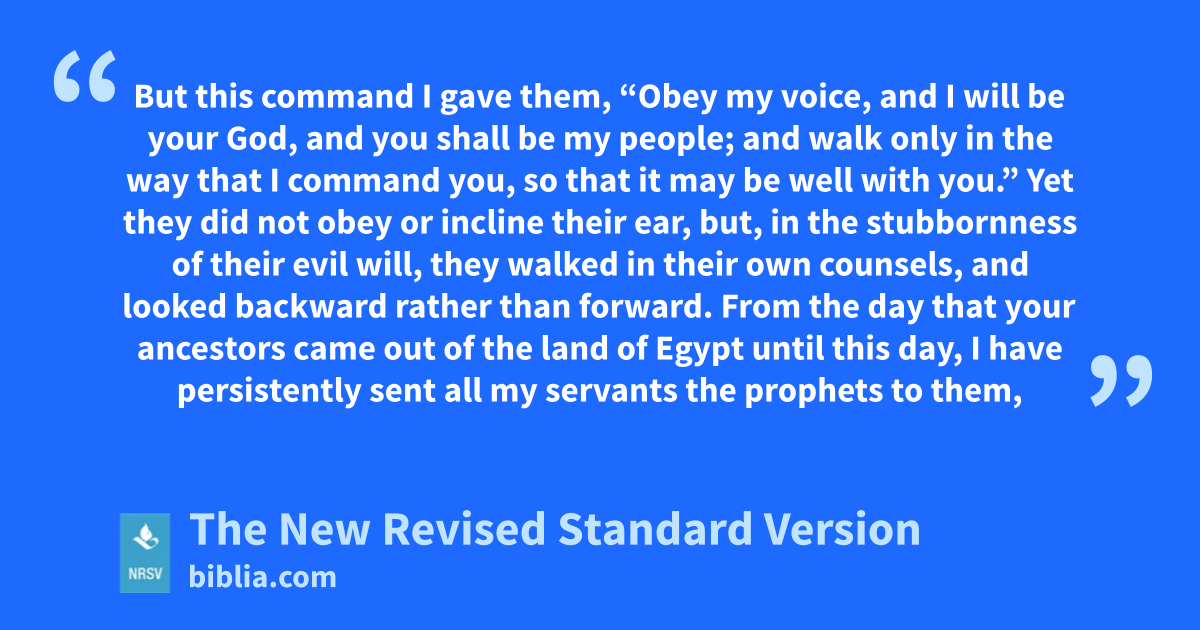 But this command I gave them, “Obey my voice, and I will be your God, and you shall be my people; and walk only in the way that I command you, so that it may be well with you.” Yet they did not obey or incline their ear, but, in the stubbornness of their evil will, they walked in their own counsels, and looked backward rather than forward. From the day that your ancestors came out of the land of Egypt until this day, I have persistently sent all my servants the prophets to them,