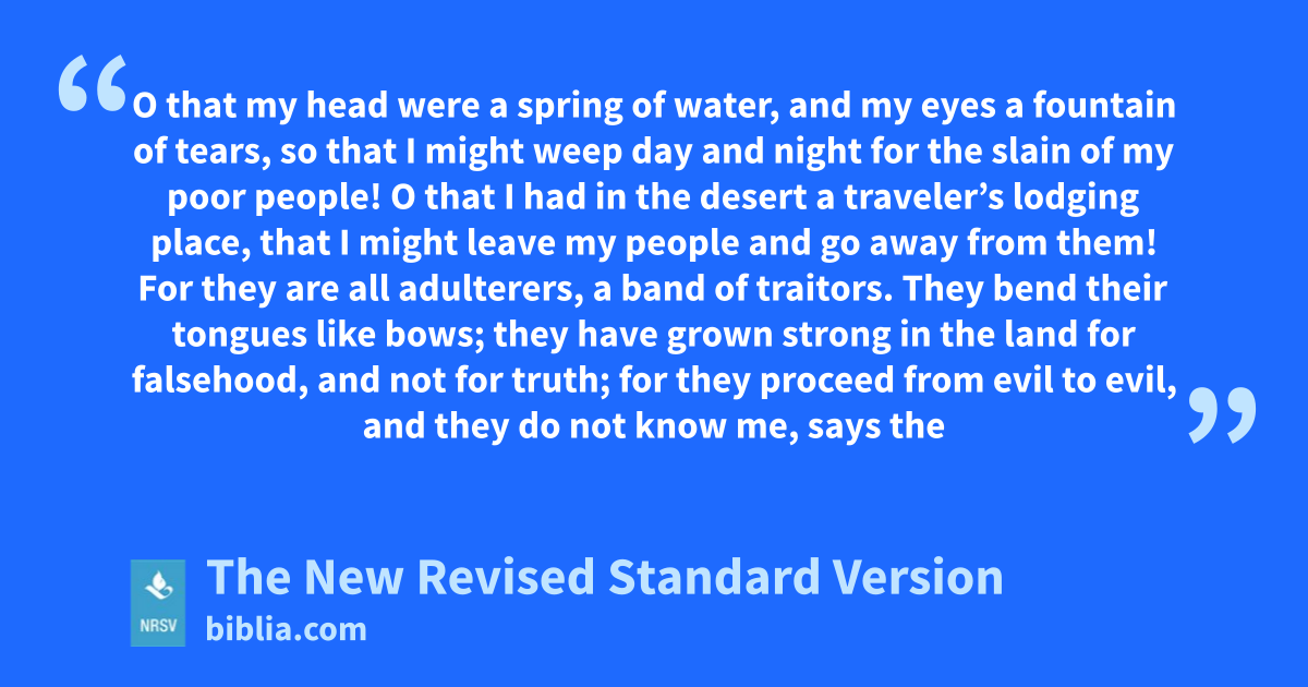 O that my head were a spring of water, and my eyes a fountain of tears, so that I might weep day and night for the slain of my poor people! O that I had in the desert a traveler’s lodging place, that I might leave my people and go away from them! For they are all adulterers, a band of traitors. They bend their tongues like bows; they have grown strong in the land for falsehood, and not for truth; for they proceed from evil to evil, and they do not know me, says the