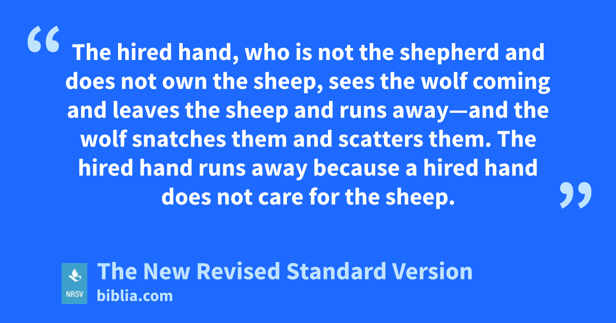 The hired hand, who is not the shepherd and does not own the sheep, sees the wolf coming and leaves the sheep and runs away—and the wolf snatches them and scatters them. The hired hand runs away because a hired hand does not care for the sheep.