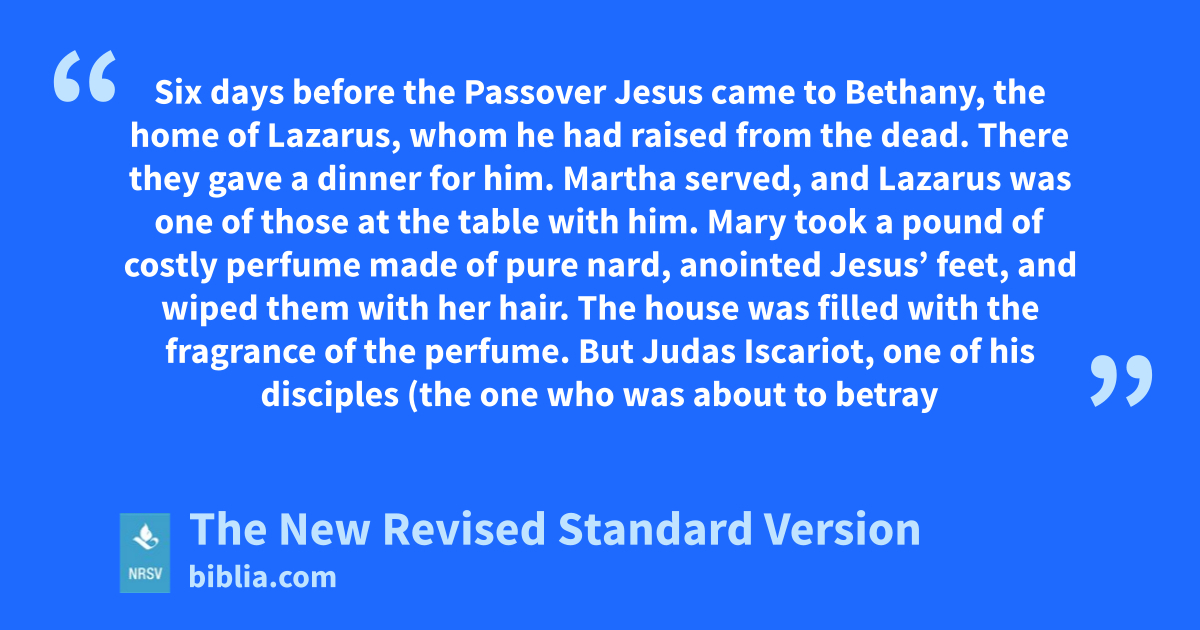 Six days before the Passover Jesus came to Bethany, the home of Lazarus, whom he had raised from the dead. There they gave a dinner for him. Martha served, and Lazarus was one of those at the table with him. Mary took a pound of costly perfume made of pure nard, anointed Jesus’ feet, and wiped them with her hair. The house was filled with the fragrance of the perfume. But Judas Iscariot, one of his disciples (the one who was about to betray