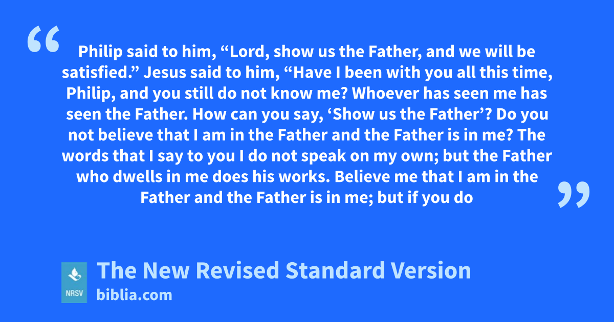 Philip said to him, “Lord, show us the Father, and we will be satisfied.” Jesus said to him, “Have I been with you all this time, Philip, and you still do not know me? Whoever has seen me has seen the Father. How can you say, ‘Show us the Father’? Do you not believe that I am in the Father and the Father is in me? The words that I say to you I do not speak on my own; but the Father who dwells in me does his works. Believe me that I am in the Father and the Father is in me; but if you do