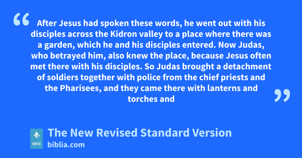 After Jesus had spoken these words, he went out with his disciples across the Kidron valley to a place where there was a garden, which he and his disciples entered. Now Judas, who betrayed him, also knew the place, because Jesus often met there with his disciples. So Judas brought a detachment of soldiers together with police from the chief priests and the Pharisees, and they came there with lanterns and torches and