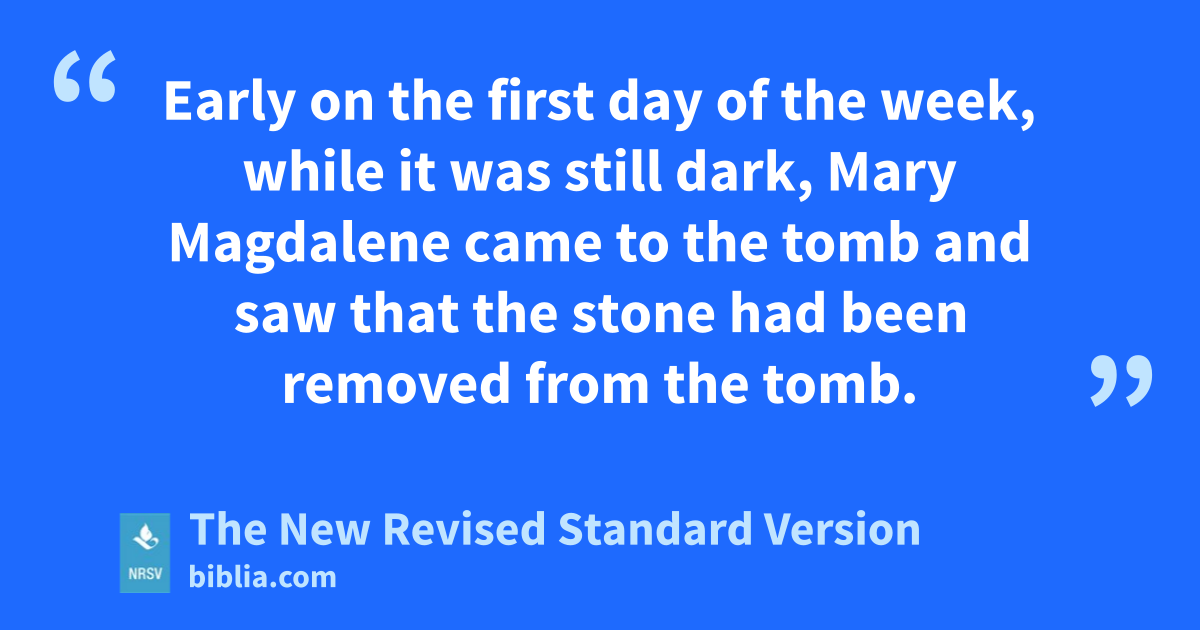 Early on the first day of the week, while it was still dark, Mary Magdalene came to the tomb and saw that the stone had been removed from the tomb.