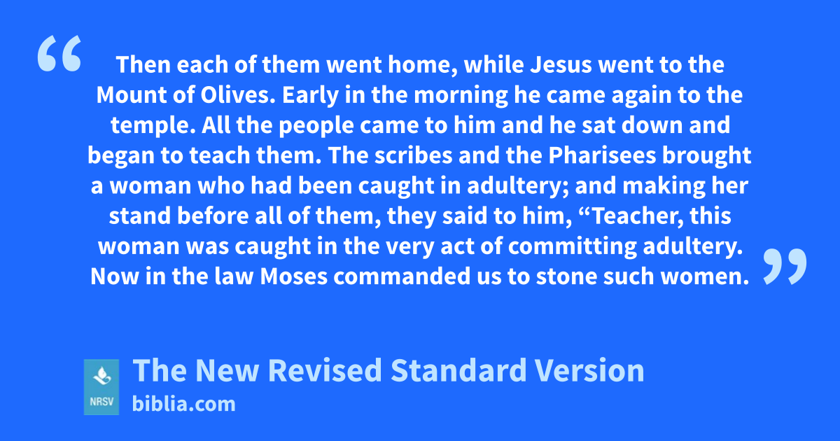 Then each of them went home, while Jesus went to the Mount of Olives. Early in the morning he came again to the temple. All the people came to him and he sat down and began to teach them. The scribes and the Pharisees brought a woman who had been caught in adultery; and making her stand before all of them, they said to him, “Teacher, this woman was caught in the very act of committing adultery. Now in the law Moses commanded us to stone such women.