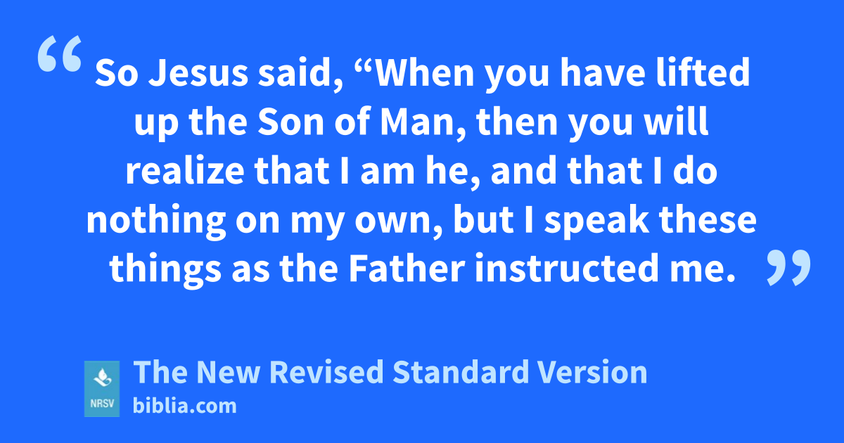 So Jesus said, “When you have lifted up the Son of Man, then you will realize that I am he, and that I do nothing on my own, but I speak these things as the Father instructed me.