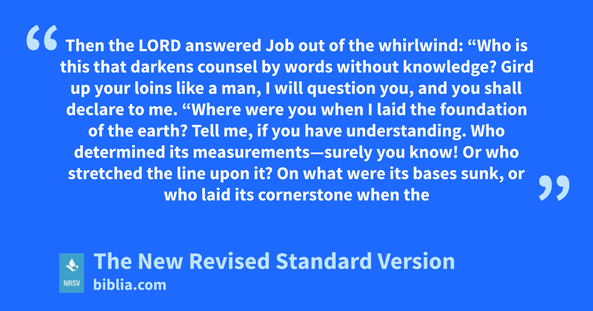 Then the LORD answered Job out of the whirlwind: “Who is this that darkens counsel by words without knowledge? Gird up your loins like a man, I will question you, and you shall declare to me. “Where were you when I laid the foundation of the earth? Tell me, if you have understanding. Who determined its measurements—surely you know! Or who stretched the line upon it? On what were its bases sunk, or who laid its cornerstone when the