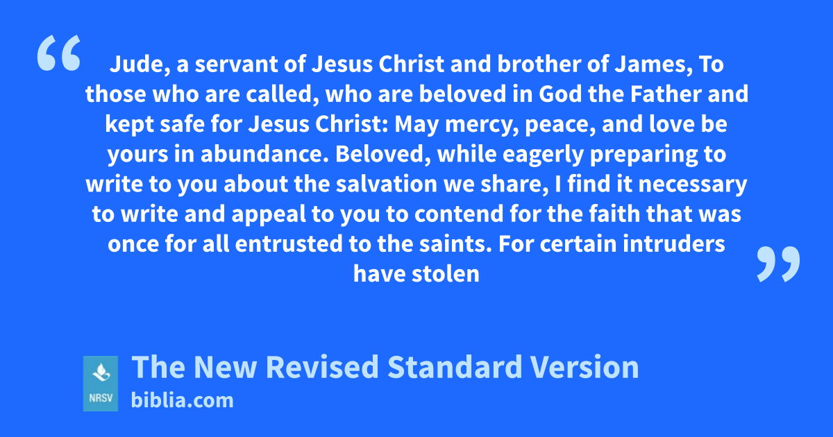 Jude, a servant of Jesus Christ and brother of James, To those who are called, who are beloved in God the Father and kept safe for Jesus Christ: May mercy, peace, and love be yours in abundance. Beloved, while eagerly preparing to write to you about the salvation we share, I find it necessary to write and appeal to you to contend for the faith that was once for all entrusted to the saints. For certain intruders have stolen