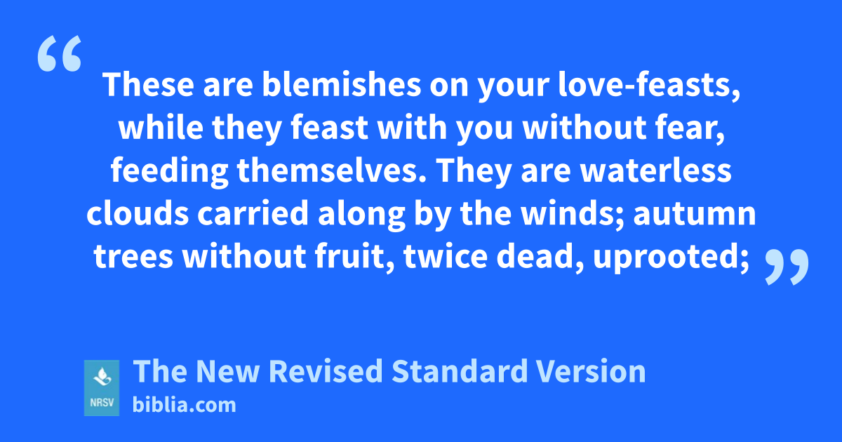 These are blemishes on your love-feasts, while they feast with you without fear, feeding themselves. They are waterless clouds carried along by the winds; autumn trees without fruit, twice dead, uprooted;
