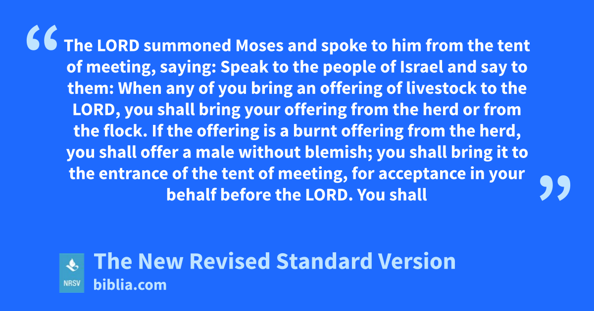 The LORD summoned Moses and spoke to him from the tent of meeting, saying: Speak to the people of Israel and say to them: When any of you bring an offering of livestock to the LORD, you shall bring your offering from the herd or from the flock. If the offering is a burnt offering from the herd, you shall offer a male without blemish; you shall bring it to the entrance of the tent of meeting, for acceptance in your behalf before the LORD. You shall