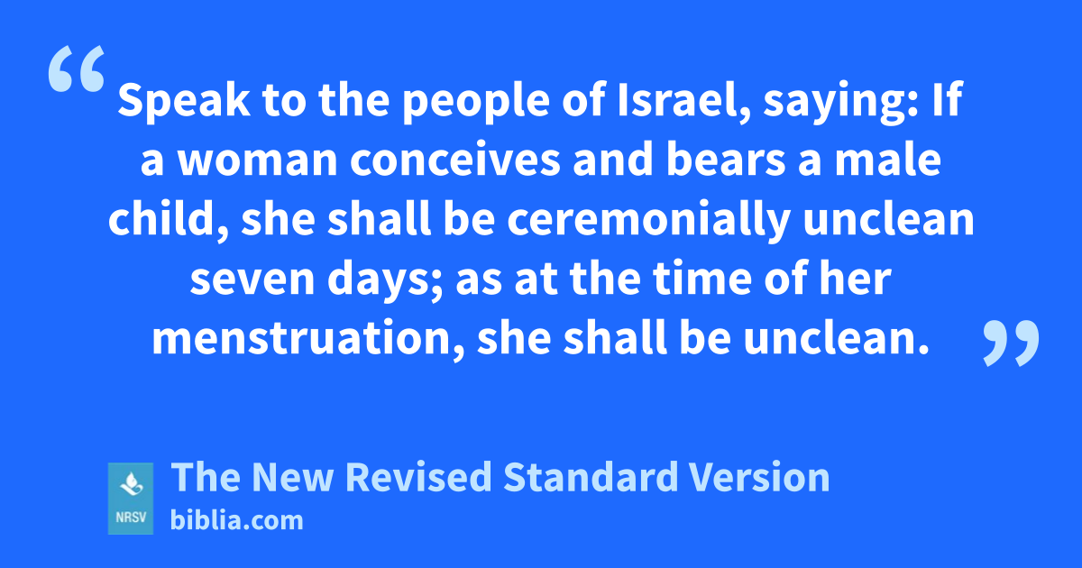 Speak to the people of Israel, saying: If a woman conceives and bears a male child, she shall be ceremonially unclean seven days; as at the time of her menstruation, she shall be unclean.