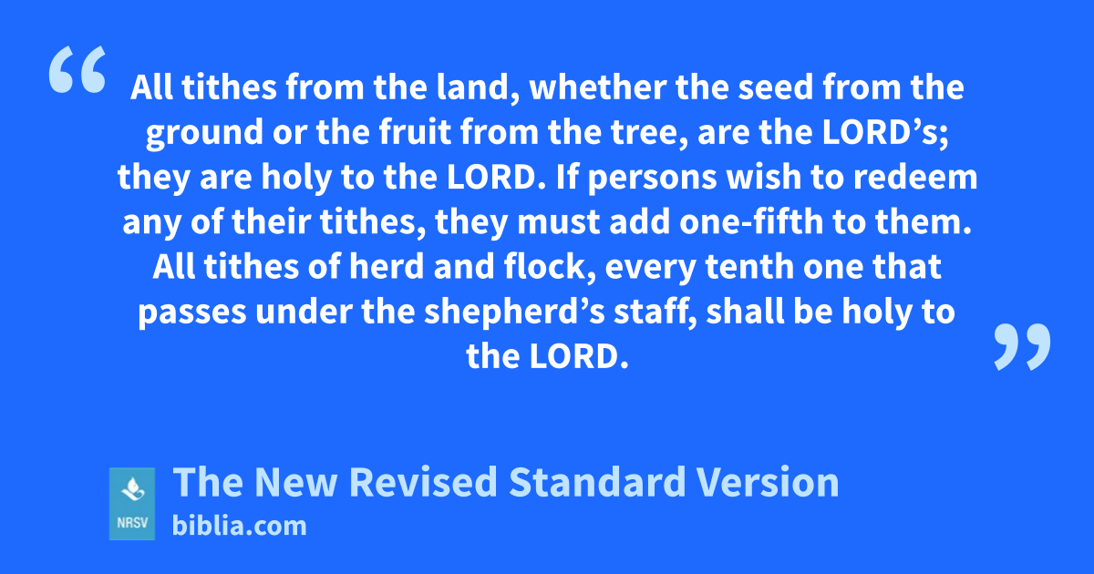 All tithes from the land, whether the seed from the ground or the fruit from the tree, are the LORD’s; they are holy to the LORD. If persons wish to redeem any of their tithes, they must add one-fifth to them. All tithes of herd and flock, every tenth one that passes under the shepherd’s staff, shall be holy to the LORD.