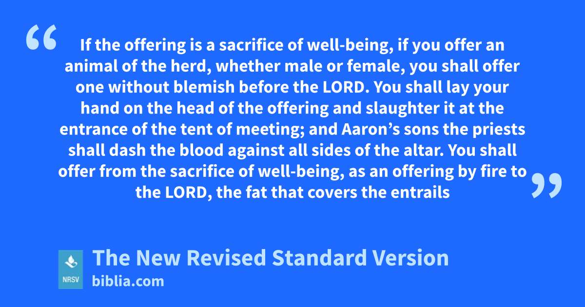 If the offering is a sacrifice of well-being, if you offer an animal of the herd, whether male or female, you shall offer one without blemish before the LORD. You shall lay your hand on the head of the offering and slaughter it at the entrance of the tent of meeting; and Aaron’s sons the priests shall dash the blood against all sides of the altar. You shall offer from the sacrifice of well-being, as an offering by fire to the LORD, the fat that covers the entrails