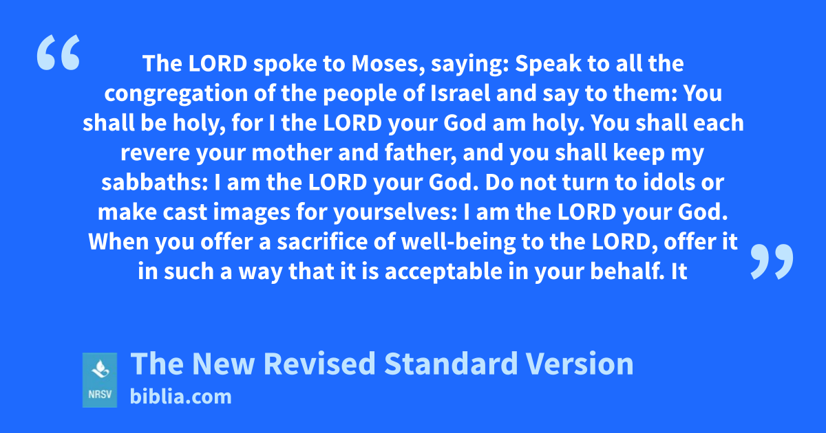 The LORD spoke to Moses, saying: Speak to all the congregation of the people of Israel and say to them: You shall be holy, for I the LORD your God am holy. You shall each revere your mother and father, and you shall keep my sabbaths: I am the LORD your God. Do not turn to idols or make cast images for yourselves: I am the LORD your God. When you offer a sacrifice of well-being to the LORD, offer it in such a way that it is acceptable in your behalf. It