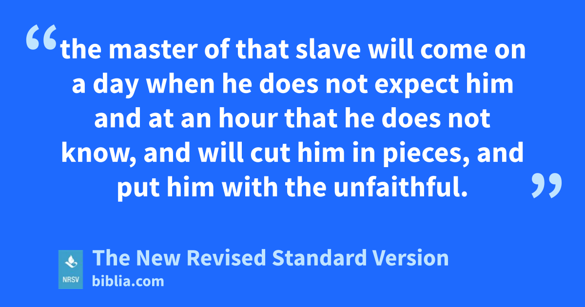 the master of that slave will come on a day when he does not expect him and at an hour that he does not know, and will cut him in pieces, and put him with the unfaithful.