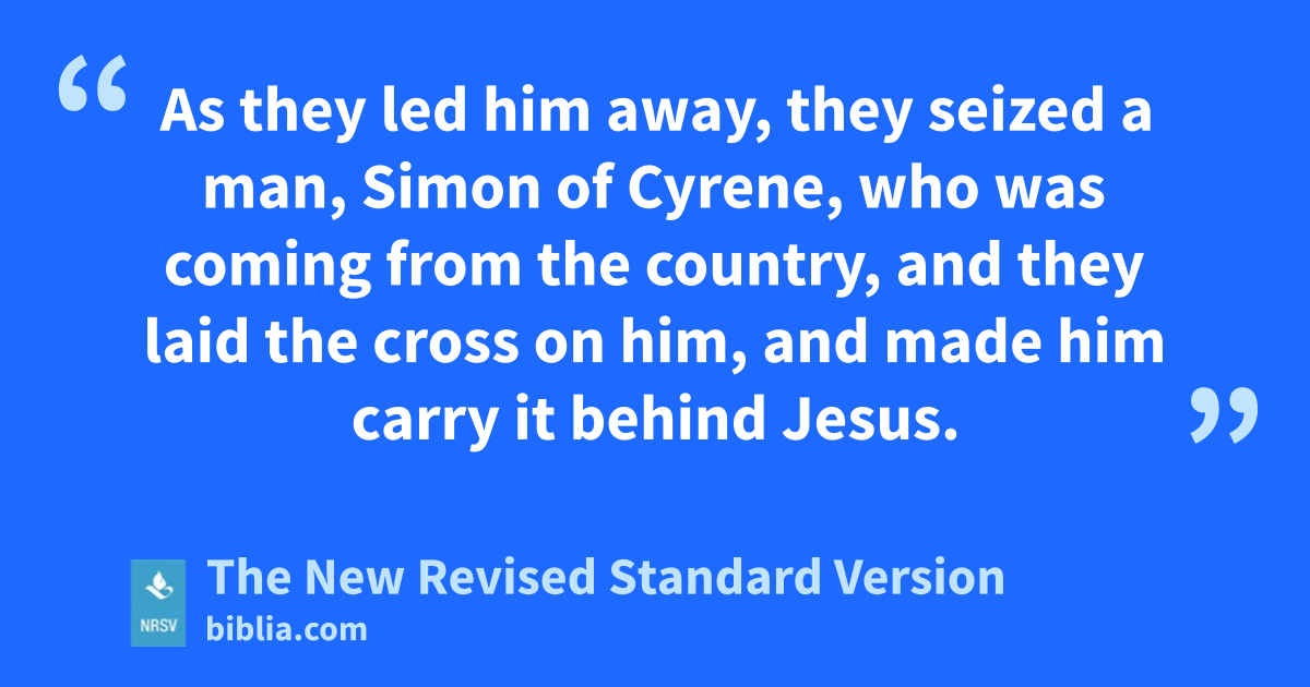 As they led him away, they seized a man, Simon of Cyrene, who was coming from the country, and they laid the cross on him, and made him carry it behind Jesus.