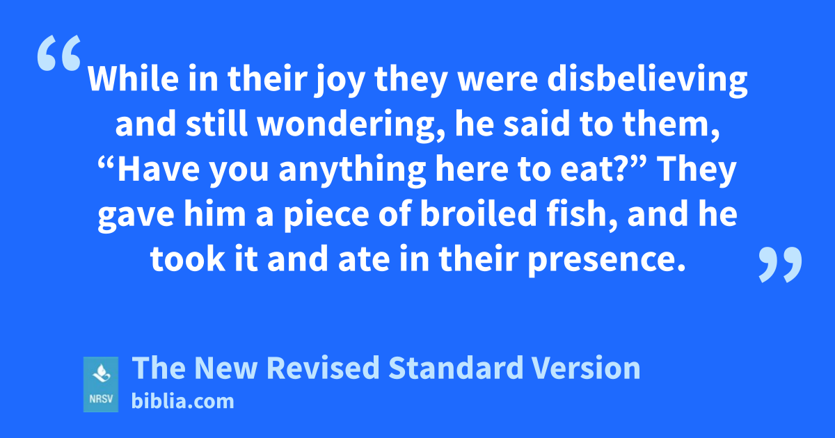 While in their joy they were disbelieving and still wondering, he said to them, “Have you anything here to eat?” They gave him a piece of broiled fish, and he took it and ate in their presence.
