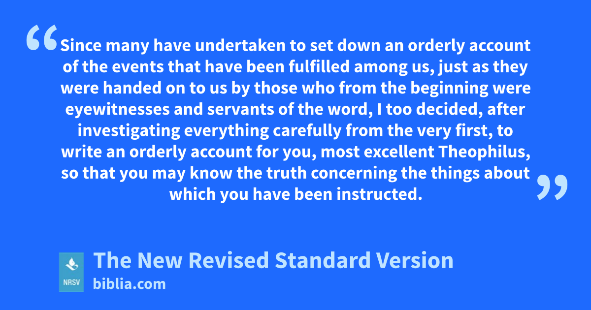 Since many have undertaken to set down an orderly account of the events that have been fulfilled among us, just as they were handed on to us by those who from the beginning were eyewitnesses and servants of the word, I too decided, after investigating everything carefully from the very first, to write an orderly account for you, most excellent Theophilus, so that you may know the truth concerning the things about which you have been instructed.