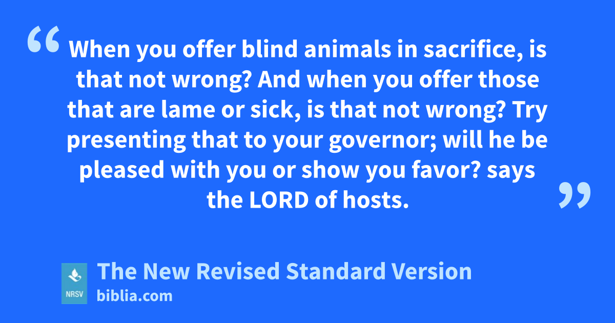 When you offer blind animals in sacrifice, is that not wrong? And when you offer those that are lame or sick, is that not wrong? Try presenting that to your governor; will he be pleased with you or show you favor? says the LORD of hosts.