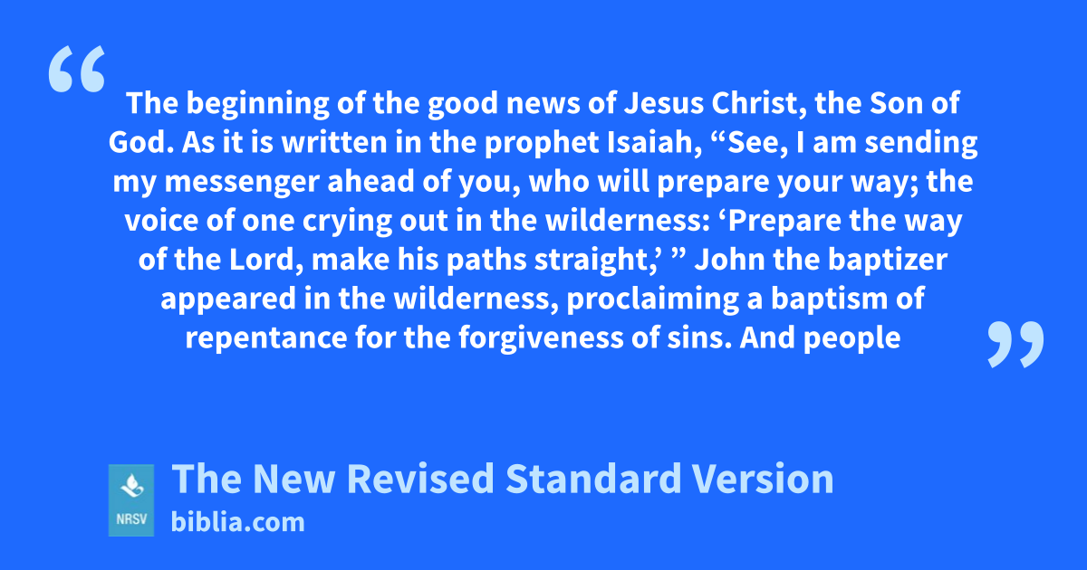 The beginning of the good news of Jesus Christ, the Son of God. As it is written in the prophet Isaiah, “See, I am sending my messenger ahead of you, who will prepare your way; the voice of one crying out in the wilderness: ‘Prepare the way of the Lord, make his paths straight,’ ” John the baptizer appeared in the wilderness, proclaiming a baptism of repentance for the forgiveness of sins. And people