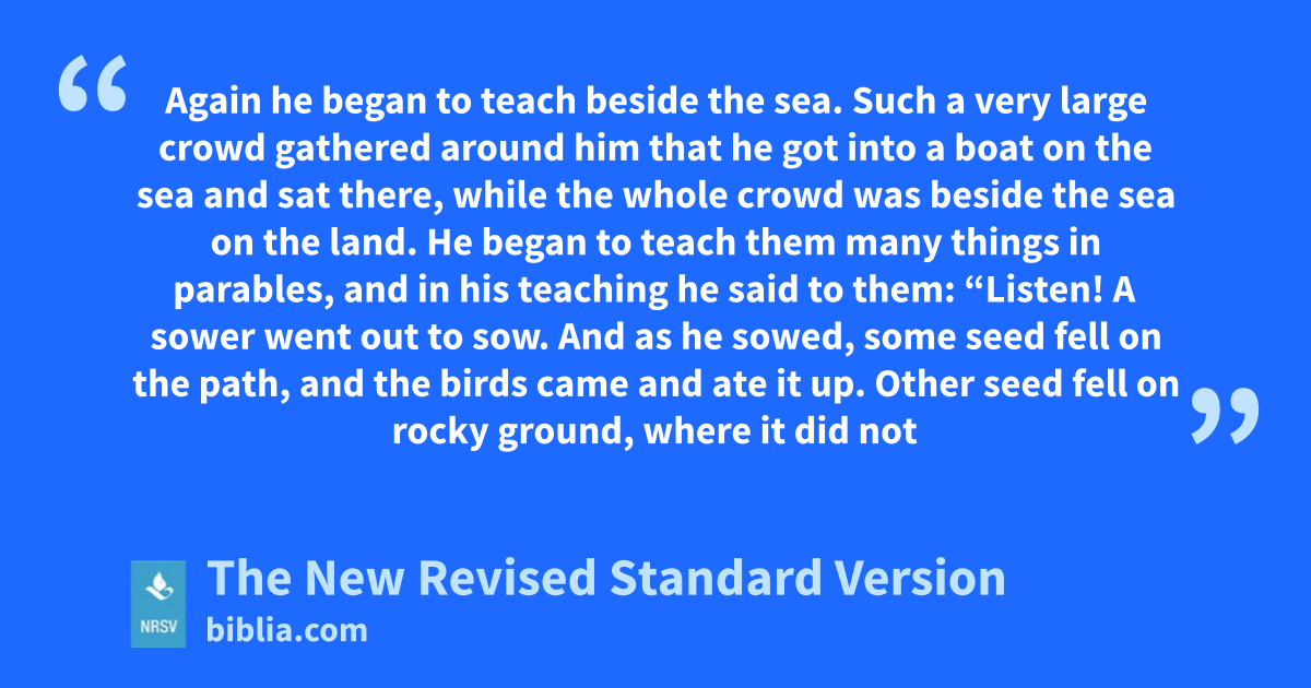 Again he began to teach beside the sea. Such a very large crowd gathered around him that he got into a boat on the sea and sat there, while the whole crowd was beside the sea on the land. He began to teach them many things in parables, and in his teaching he said to them: “Listen! A sower went out to sow. And as he sowed, some seed fell on the path, and the birds came and ate it up. Other seed fell on rocky ground, where it did not