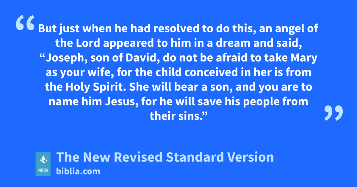 But just when he had resolved to do this, an angel of the Lord appeared to him in a dream and said, “Joseph, son of David, do not be afraid to take Mary as your wife, for the child conceived in her is from the Holy Spirit. She will bear a son, and you are to name him Jesus, for he will save his people from their sins.”