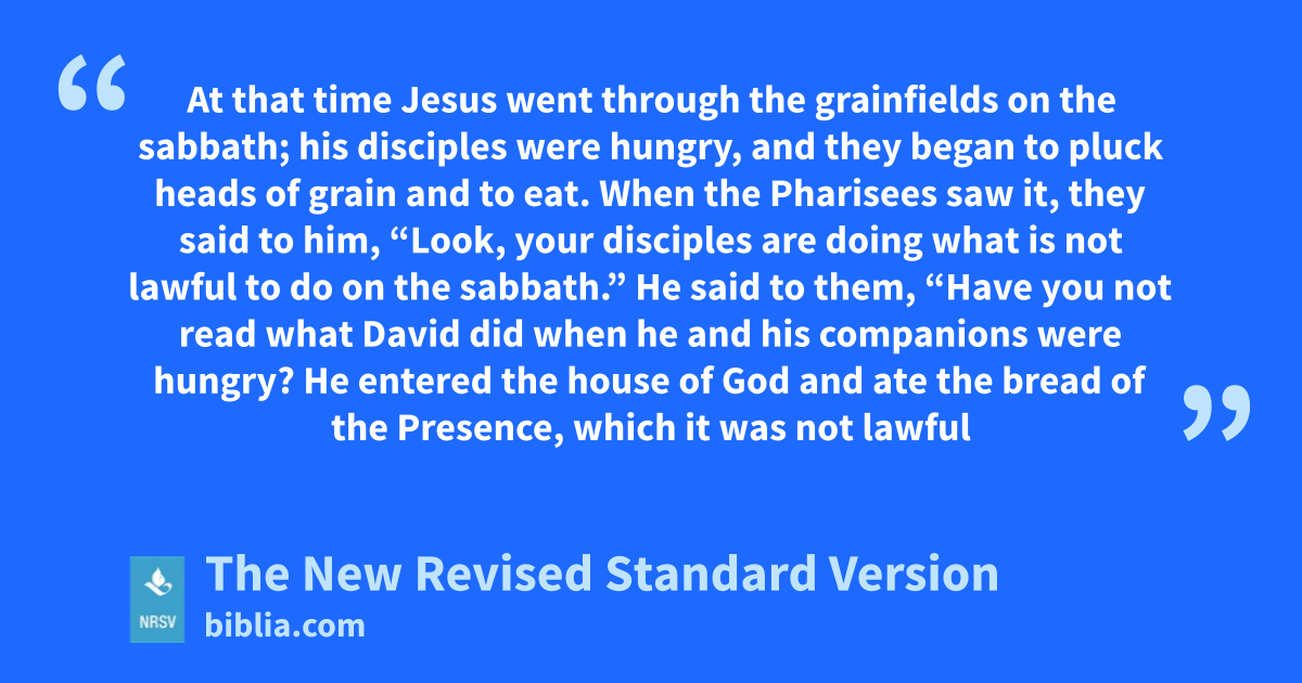 At that time Jesus went through the grainfields on the sabbath; his disciples were hungry, and they began to pluck heads of grain and to eat. When the Pharisees saw it, they said to him, “Look, your disciples are doing what is not lawful to do on the sabbath.” He said to them, “Have you not read what David did when he and his companions were hungry? He entered the house of God and ate the bread of the Presence, which it was not lawful