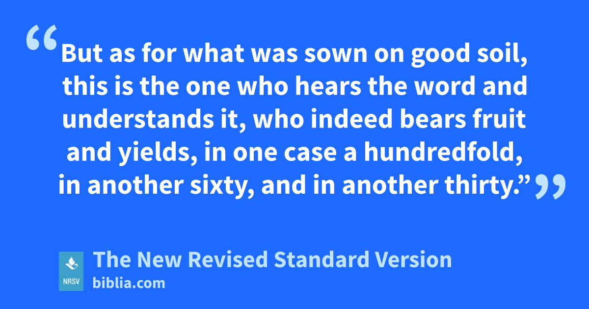 But as for what was sown on good soil, this is the one who hears the word and understands it, who indeed bears fruit and yields, in one case a hundredfold, in another sixty, and in another thirty.”