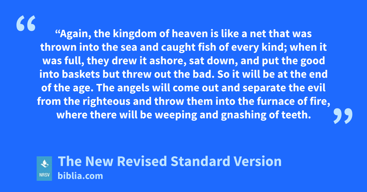 “Again, the kingdom of heaven is like a net that was thrown into the sea and caught fish of every kind; when it was full, they drew it ashore, sat down, and put the good into baskets but threw out the bad. So it will be at the end of the age. The angels will come out and separate the evil from the righteous and throw them into the furnace of fire, where there will be weeping and gnashing of teeth.