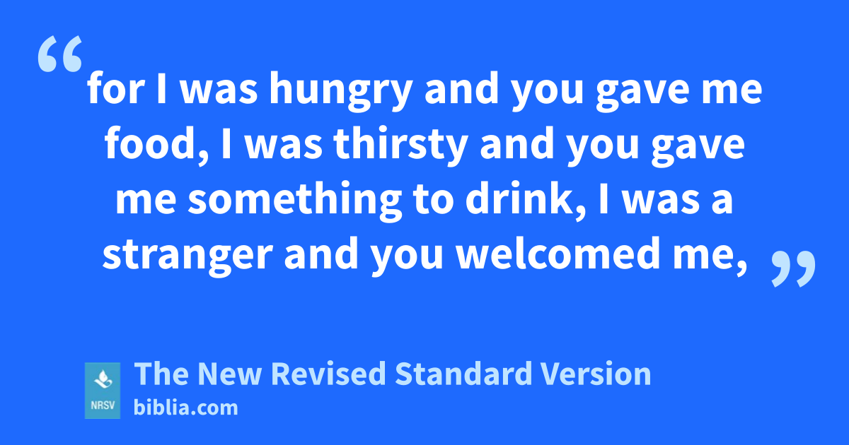 for I was hungry and you gave me food, I was thirsty and you gave me something to drink, I was a stranger and you welcomed me,