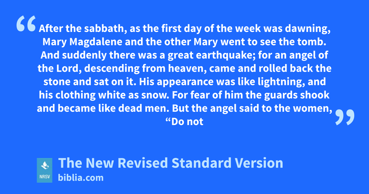 After the sabbath, as the first day of the week was dawning, Mary Magdalene and the other Mary went to see the tomb. And suddenly there was a great earthquake; for an angel of the Lord, descending from heaven, came and rolled back the stone and sat on it. His appearance was like lightning, and his clothing white as snow. For fear of him the guards shook and became like dead men. But the angel said to the women, “Do not