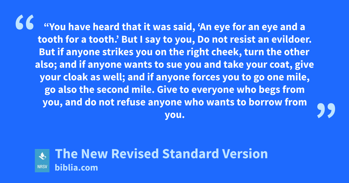 “You have heard that it was said, ‘An eye for an eye and a tooth for a tooth.’ But I say to you, Do not resist an evildoer. But if anyone strikes you on the right cheek, turn the other also; and if anyone wants to sue you and take your coat, give your cloak as well; and if anyone forces you to go one mile, go also the second mile. Give to everyone who begs from you, and do not refuse anyone who wants to borrow from you.