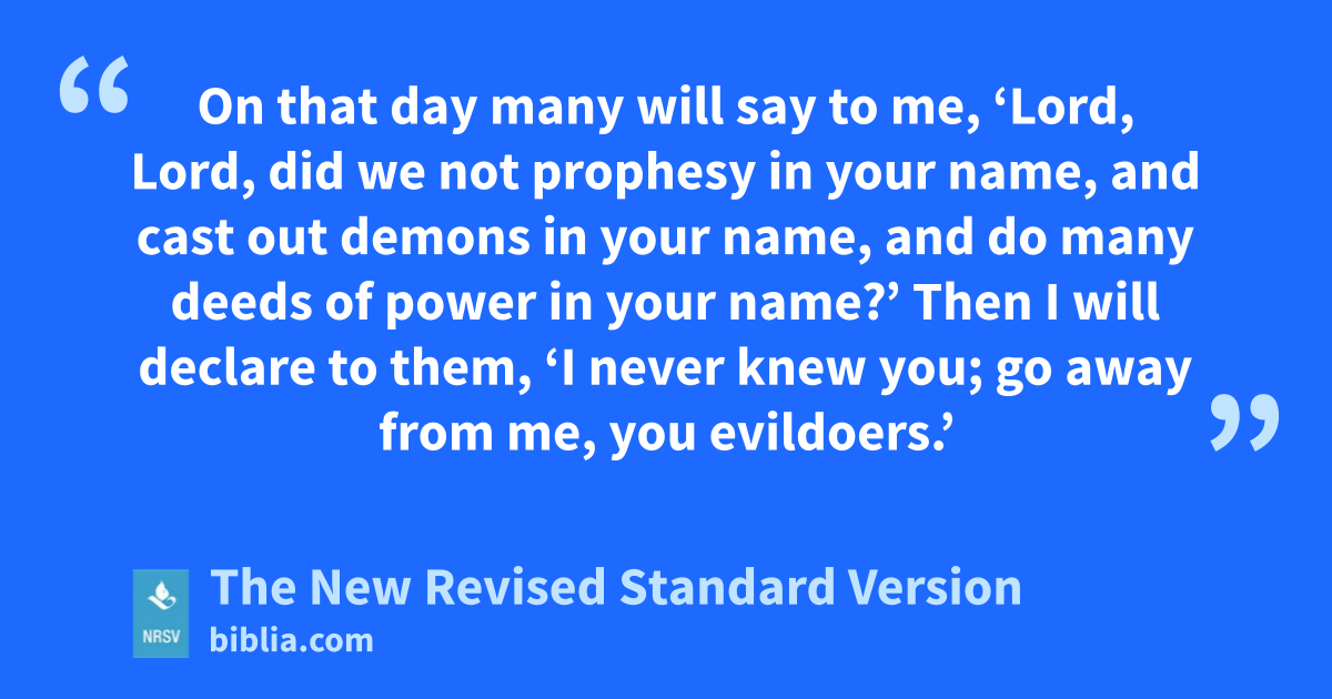 On that day many will say to me, ‘Lord, Lord, did we not prophesy in your name, and cast out demons in your name, and do many deeds of power in your name?’ Then I will declare to them, ‘I never knew you; go away from me, you evildoers.’