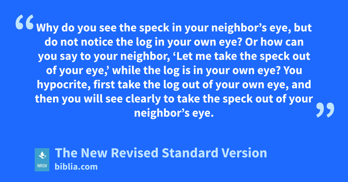Why do you see the speck in your neighbor’s eye, but do not notice the log in your own eye? Or how can you say to your neighbor, ‘Let me take the speck out of your eye,’ while the log is in your own eye? You hypocrite, first take the log out of your own eye, and then you will see clearly to take the speck out of your neighbor’s eye.