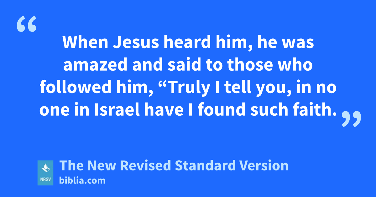When Jesus heard him, he was amazed and said to those who followed him, “Truly I tell you, in no one in Israel have I found such faith.