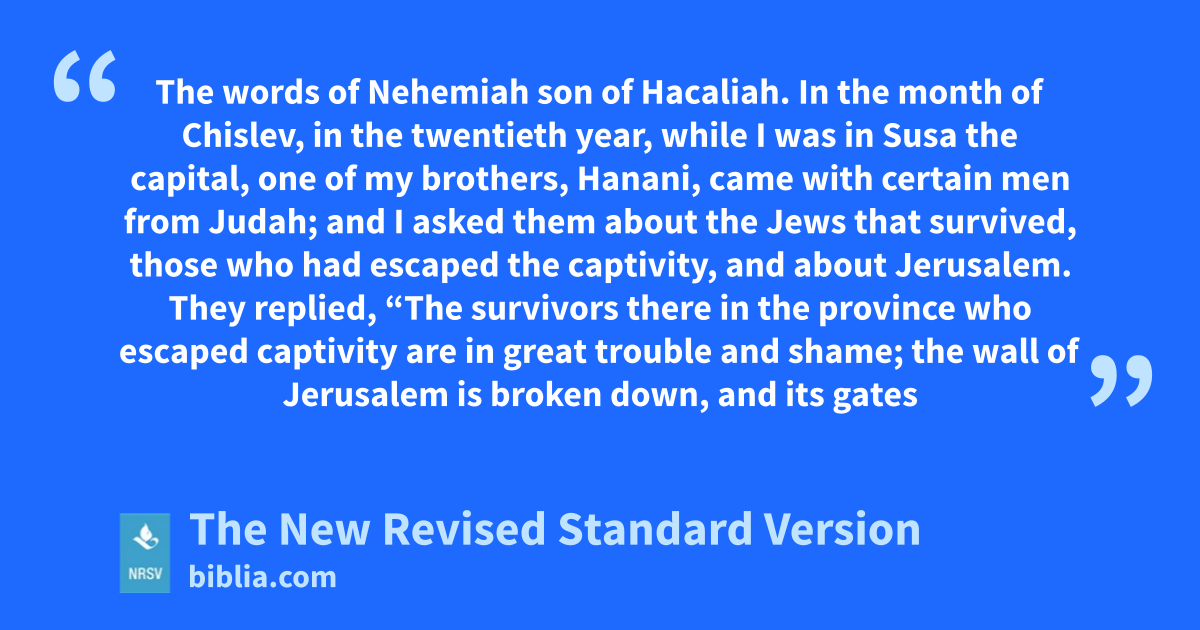 The words of Nehemiah son of Hacaliah. In the month of Chislev, in the twentieth year, while I was in Susa the capital, one of my brothers, Hanani, came with certain men from Judah; and I asked them about the Jews that survived, those who had escaped the captivity, and about Jerusalem. They replied, “The survivors there in the province who escaped captivity are in great trouble and shame; the wall of Jerusalem is broken down, and its gates