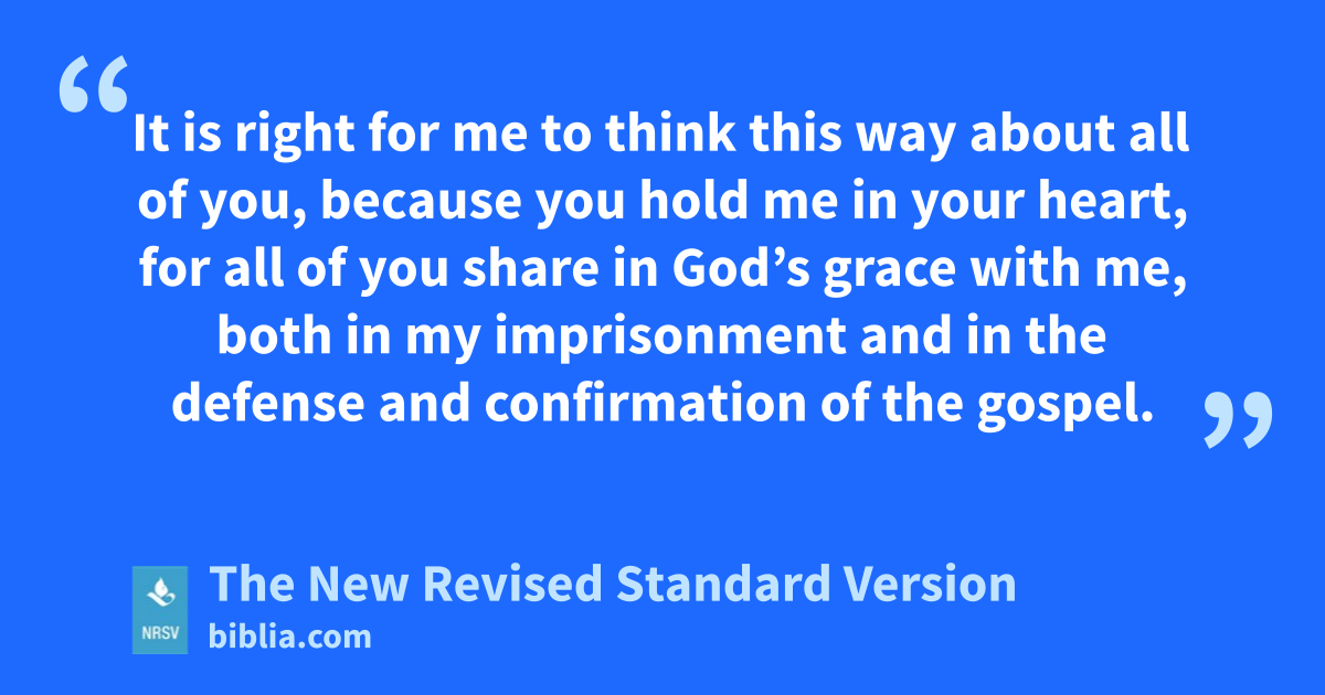 It is right for me to think this way about all of you, because you hold me in your heart, for all of you share in God’s grace with me, both in my imprisonment and in the defense and confirmation of the gospel.