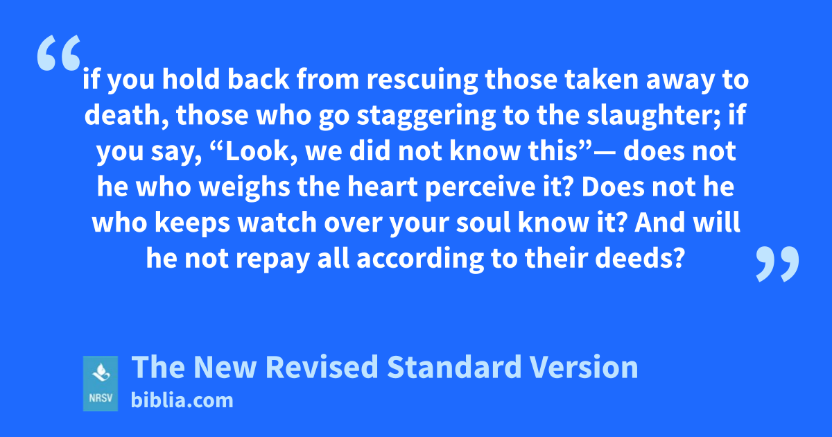 if you hold back from rescuing those taken away to death, those who go staggering to the slaughter; if you say, “Look, we did not know this”— does not he who weighs the heart perceive it? Does not he who keeps watch over your soul know it? And will he not repay all according to their deeds?