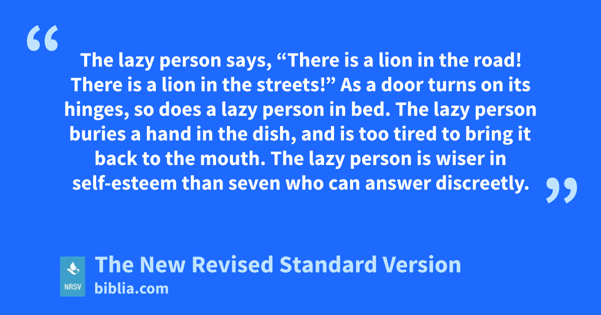 The lazy person says, “There is a lion in the road! There is a lion in the streets!” As a door turns on its hinges, so does a lazy person in bed. The lazy person buries a hand in the dish, and is too tired to bring it back to the mouth. The lazy person is wiser in self-esteem than seven who can answer discreetly.