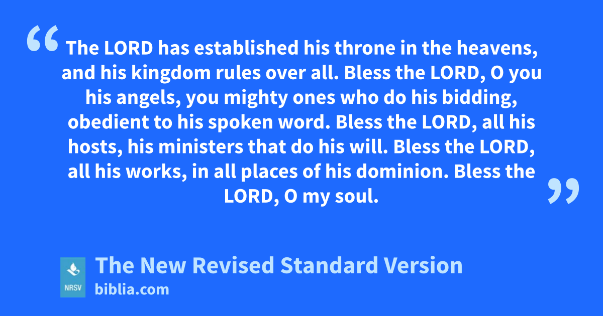 The LORD has established his throne in the heavens, and his kingdom rules over all. Bless the LORD, O you his angels, you mighty ones who do his bidding, obedient to his spoken word. Bless the LORD, all his hosts, his ministers that do his will. Bless the LORD, all his works, in all places of his dominion. Bless the LORD, O my soul.